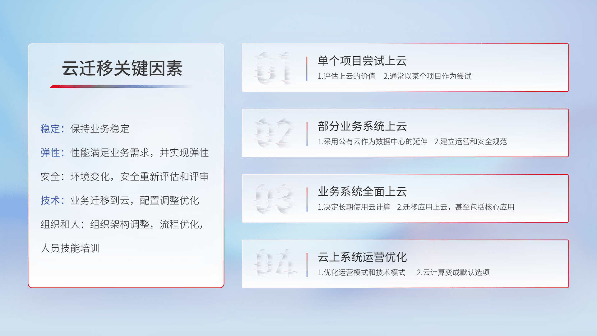 结合实际业务,,,从规划设计、、、云平台选型、、云原生改造、、、数据迁移、、、集成交付,,迁移全过程为客户识别最佳上云路径,,,做好风险识别管理,,设计网络架构、、、身份权限、、、安全审计合规、、、、操作审计、、日志审计、、、、监控告警策略、、、多站点容灾设计等,,,,对云上基础设施进行整体规划,,提升IT治理水平,,,以满足弹性、、高可用、、、、高性能的需求。。。