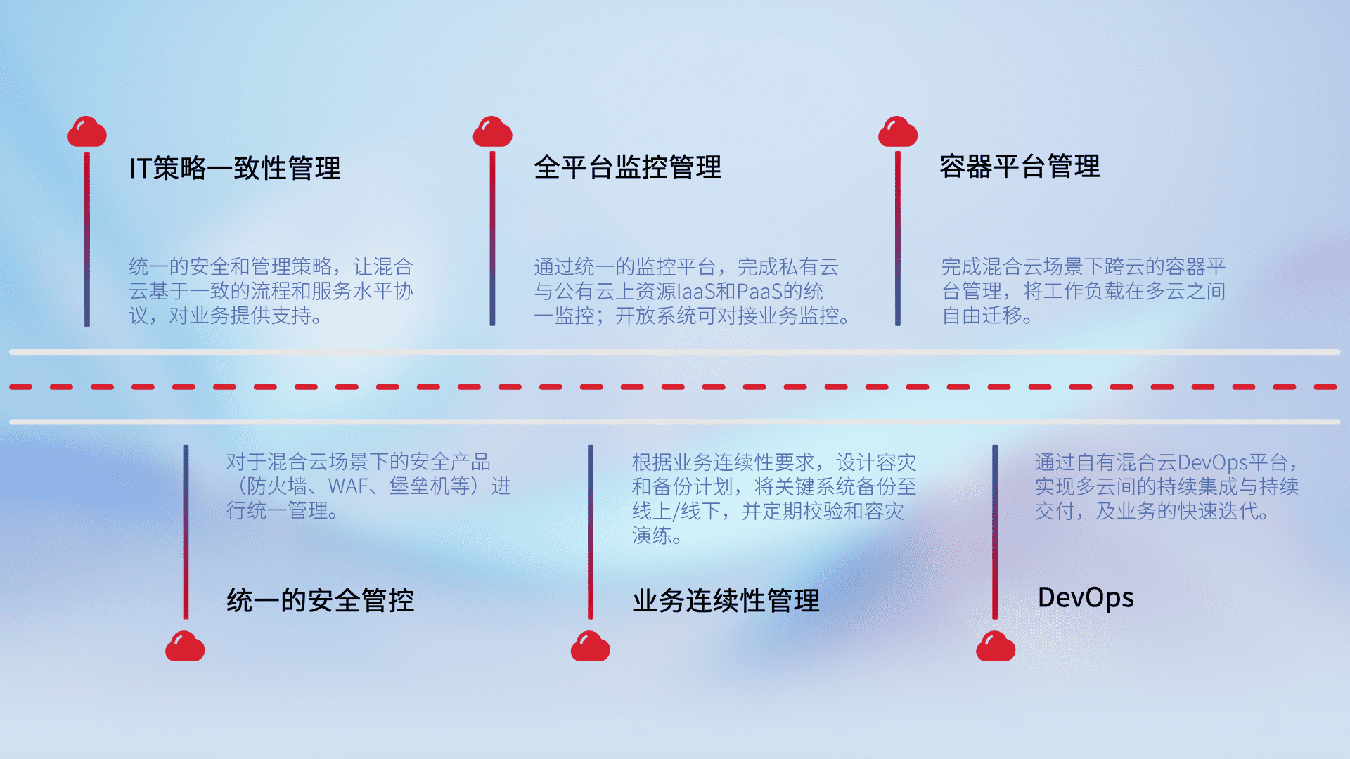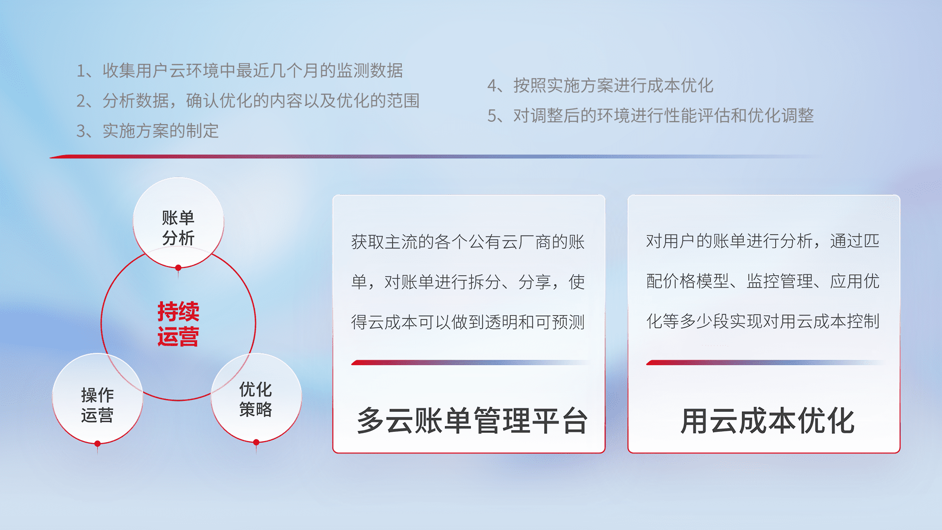通过多云纳管,,,以统一的资源数据模型把客户的云资源进行抽象和封装,,,进而实现对多云资源的统一操作,,,保障云资源管理的可靠性、、、稳定性与可用性。。。。量身定制化运维内容,,,,配置、、、、开发运维、、、补丁管理、、、、备份、、监控、、认证和访问管理、、、审计和日常巡检等,,保障在用云过程中的可靠度,,,,稳定度以及高可用率。。。