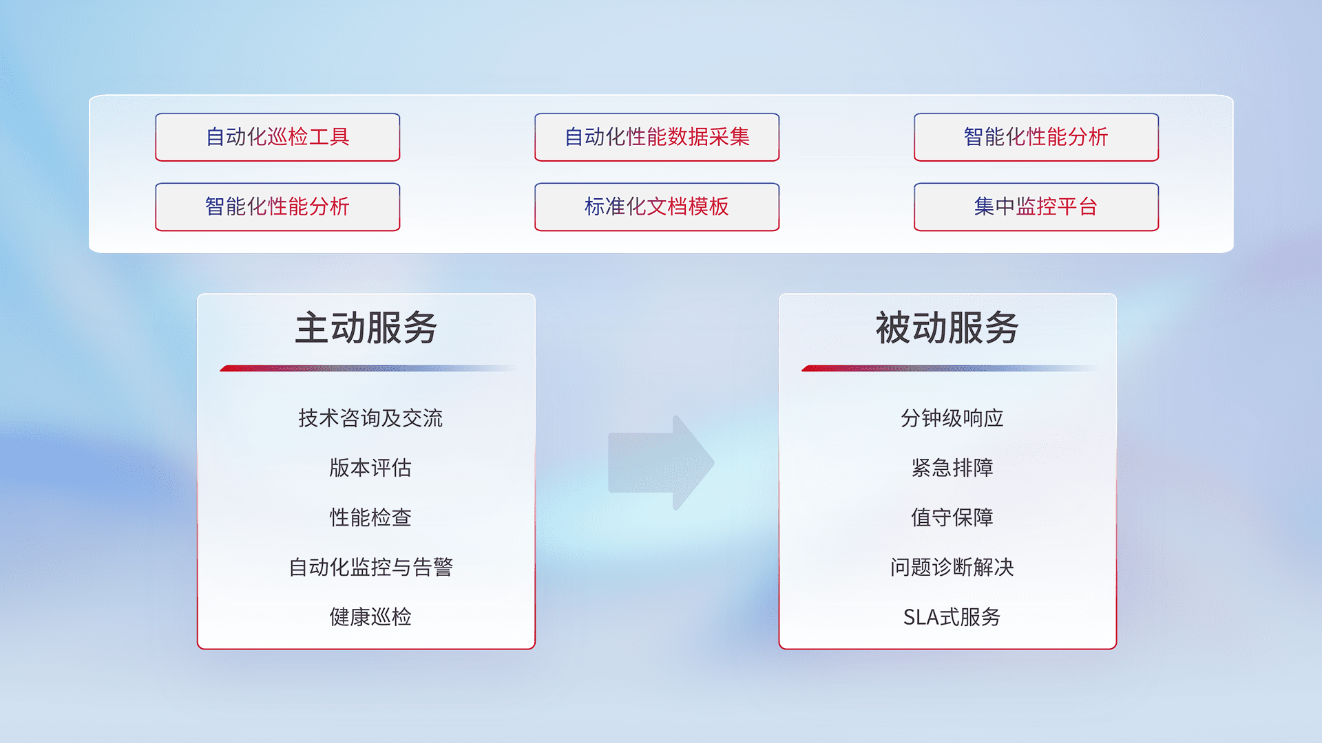 智能化工具和标准化文档,,保障服务质量,,,,提供主动服务(包含技术咨询、、、、版本评估、、、性能检查、、、自动化监控与告警、、、、健康巡检)和被动服务包含(分钟级响应、、紧急排障、、、、值守保障、、、、问题诊断解决、、SLA服务)。。。。
